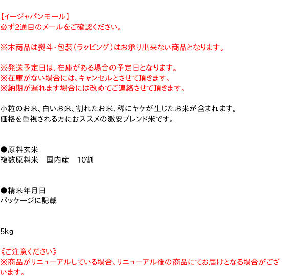 ●原料玄米 複数原料米 国内産 10割 ●精米年月日 パッケージに記載 5kg【メーカー・製造または販売元】京阪米穀株式会社072-823-9150【広告文責】株式会社イージャパンアンドカンパニーズ 072-875-6666《ご注意ください》 ※本商品はキャンセル・返品・交換不可の商品です。